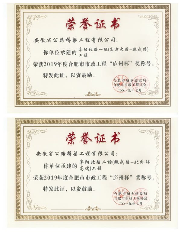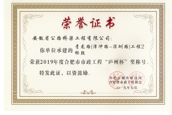 市政分公司三項目喜獲“廬州杯” 發(fā)布時間:2019年07月29日 來源:市政分公司 發(fā)布人: 作者:王東 瀏覽:3656次 近日從合肥市政工程協(xié)會獲悉,公司承建的阜陽北路一標(biāo)、阜陽北路二標(biāo)、青龍路二標(biāo)等項目喜獲“廬州杯”。截至目前,市政分公司已累計獲得19個“廬州杯”獎項。