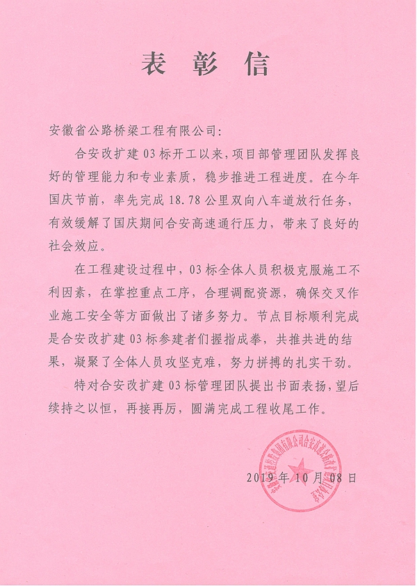 近日,合安高速改擴建項目辦發(fā)來表彰信,對公司承建的第三標段給予書面表揚。
