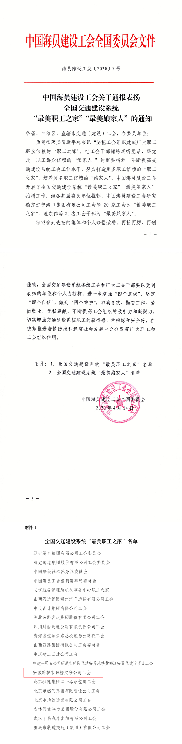 近日,中國海員建設(shè)工會全國委員會下發(fā)通知,通報了全國交通建設(shè)系統(tǒng)“最美職工之家”評選結(jié)果,市政分公司工會成為安徽省唯一一家獲此殊榮的基層工會。