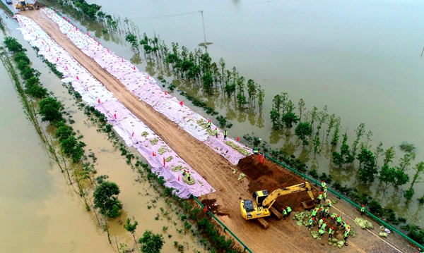 7月23日下午5時,石頭鎮(zhèn)水位上漲迅猛,廬江縣重要防汛通道X092線150米漫水公路淹沒,嚴重威脅當(dāng)?shù)厝罕娚钜约胺姥闯鲂小;罩荽蟮理椖垦杆傩袆?,組織人員70余人,機械數(shù)十臺,挖土2000方,裝填沙袋5000只,構(gòu)筑起兩道安心墻。