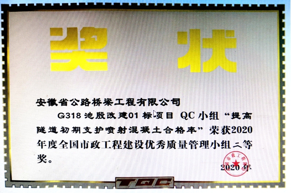 近日,從中國市政工程協(xié)會傳來喜訊,道路分公司G318池殷改建01標QC小組申報的《提高隧道初期支護噴射混凝土合格率》課題,榮獲2020年度全國市政工程建設(shè)優(yōu)秀質(zhì)量管理小組二等獎。此前,該項課題還榮獲了安徽省市政工程建設(shè)優(yōu)秀QC小組一等獎、安徽省建設(shè)行業(yè)質(zhì)量與安全協(xié)會QC成果二等獎、合肥市市政工程建設(shè)管理小組一等獎等多項殊榮。