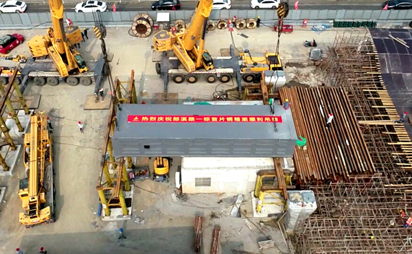 郎溪路(裕溪路—明皇路)工程01標(biāo)項(xiàng)目首片鋼箱梁成功吊裝