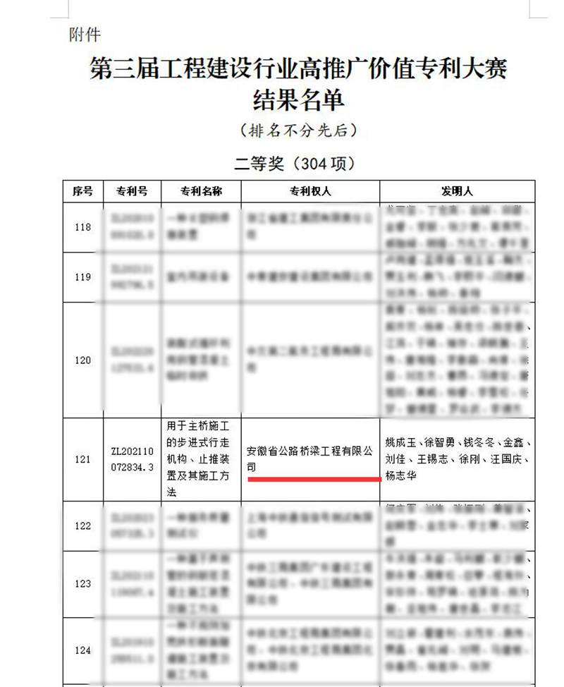 近日,中國(guó)施工企業(yè)管理協(xié)會(huì)“第三屆工程建設(shè)行業(yè)高推廣價(jià)值專(zhuān)利大賽決賽”評(píng)選結(jié)果揭曉。由公司報(bào)送的《用于主橋施工的步進(jìn)式行走機(jī)構(gòu)、止推裝置及其施工方法》實(shí)用新型專(zhuān)利,在全國(guó)2498個(gè)參賽項(xiàng)目、19個(gè)復(fù)賽項(xiàng)目中脫穎而出,榮獲二等獎(jiǎng),實(shí)現(xiàn)了公司在該類(lèi)別獎(jiǎng)項(xiàng)的新突破。