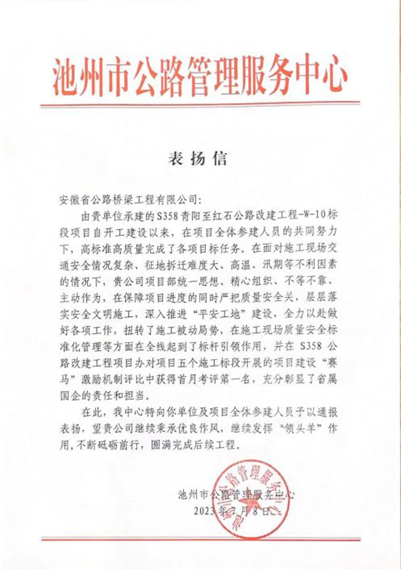 來信指出,公司承建的S358青陽至紅石公路改建工程W10標項目開工建設以來,面對現(xiàn)場交通安全情況復雜、征遷難度大、高溫、汛期等不利因素,不等不靠、主動作為,在保障進度的同時,推進“平安工地”建設,迅速扭轉被動局勢,在質量安全標準化管理等方面全線起到標桿引領作用,榮獲S358公路改建工程項目建設“賽馬”激勵機制首月考評第一名,彰顯了省屬國有企業(yè)的責任與擔當。