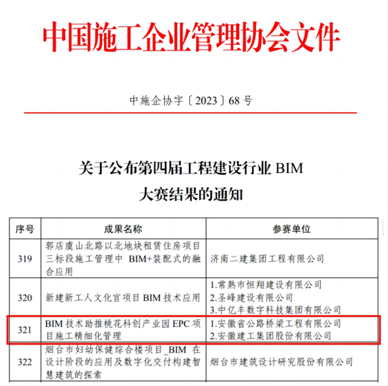 近日,全國(guó)第四屆工程建設(shè)行業(yè)BIM大賽結(jié)果揭曉,公司申報(bào)的《BIM技術(shù)助推桃花科創(chuàng)產(chǎn)業(yè)園EPC項(xiàng)目施工精細(xì)化管理》在3153項(xiàng)參賽成果中脫穎而出,榮獲建筑工程綜合應(yīng)用類三等獎(jiǎng),此次獲獎(jiǎng)是公司再次獲得國(guó)家級(jí)BIM技術(shù)應(yīng)用獎(jiǎng)項(xiàng)。