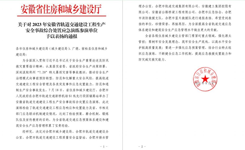 近日,安徽省住房和城鄉(xiāng)建設(shè)廳發(fā)文通報表揚(yáng)安徽建工集團(tuán)控股有限公司、安徽省公路橋梁工程有限公司在2023年度安徽省軌道交通建設(shè)工程綜合處置應(yīng)急演練中所作出的突出貢獻(xiàn)和優(yōu)異表現(xiàn)。