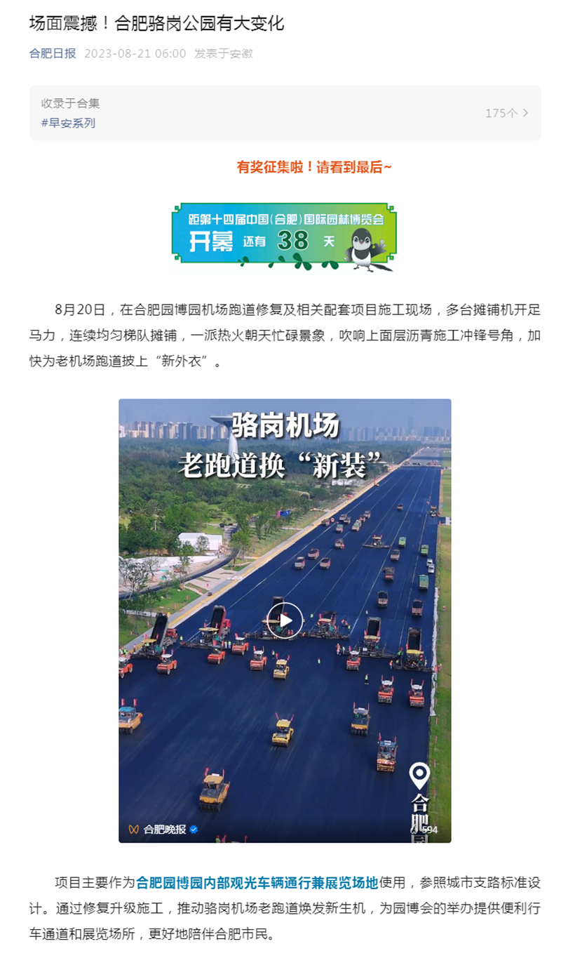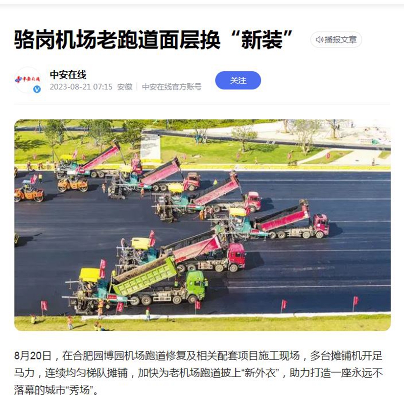8月20日,公司承建的駱崗中央公園合肥園博園機(jī)場跑道修復(fù)工程項目進(jìn)行瀝青攤鋪施工,中安在線、合肥日報、江淮晨報和合肥晚報等多家省市級媒體聚焦報道。