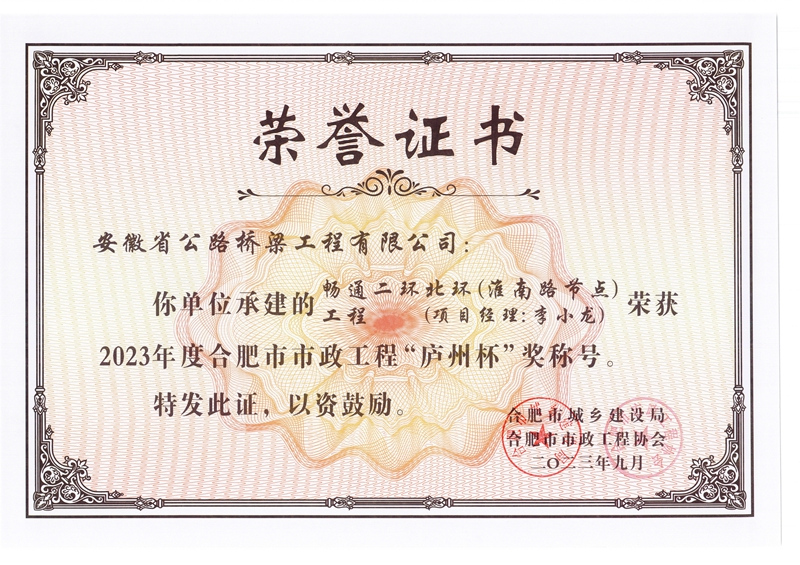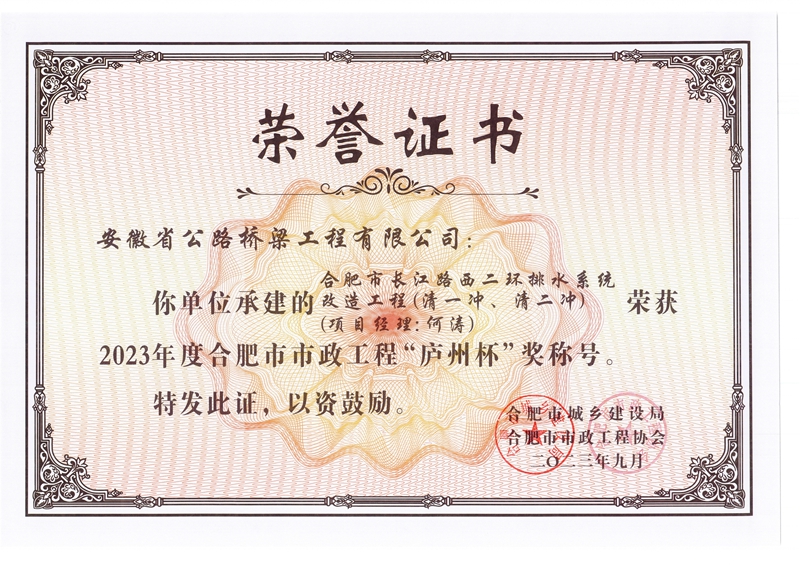 日前,由公司承建的郎溪路(裕溪路-明皇路)工程一標、暢通二環(huán)北環(huán)(淮南路節(jié)點)工程、合肥市長江路西二環(huán)排水系統(tǒng)改造工程(清一沖、清二沖)三個市政項目榮獲2023年度合肥市市政工程“廬州杯”獎。