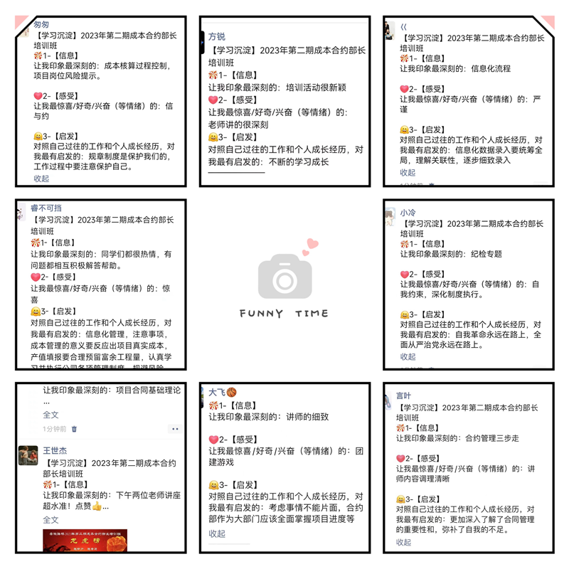 本次培訓(xùn)班課程由公司內(nèi)部培訓(xùn)師講授,課程設(shè)置方面注重以立足公司生產(chǎn)實際的真實案例進(jìn)行分析,旨在強(qiáng)化項目成本合約部長必備的專業(yè)技能和職業(yè)素養(yǎng),具體包括項目成本策劃、合約部信息化操作、項目合同管理法律風(fēng)險防范、合約部基礎(chǔ)管理、二次經(jīng)營、紀(jì)檢專題培訓(xùn)、情緒與壓力管理等內(nèi)容。