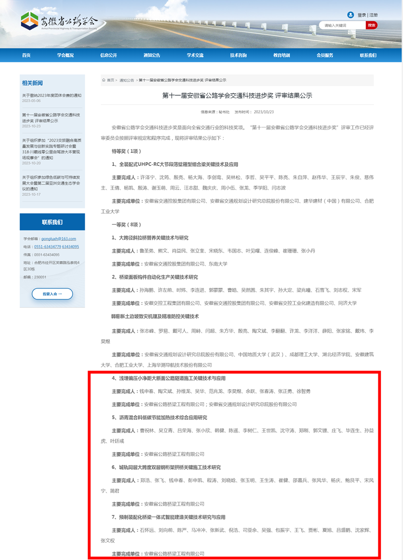 近日,2023年第十一屆安徽省公路學(xué)會(huì)交通科技進(jìn)步獎(jiǎng)評(píng)審結(jié)果揭曉,公司申報(bào)的《淺埋偏壓小凈距大斷面公路隧道施工關(guān)鍵技術(shù)與應(yīng)用》等四項(xiàng)科研項(xiàng)目均獲安徽省交通科技進(jìn)步獎(jiǎng)一等獎(jiǎng)。