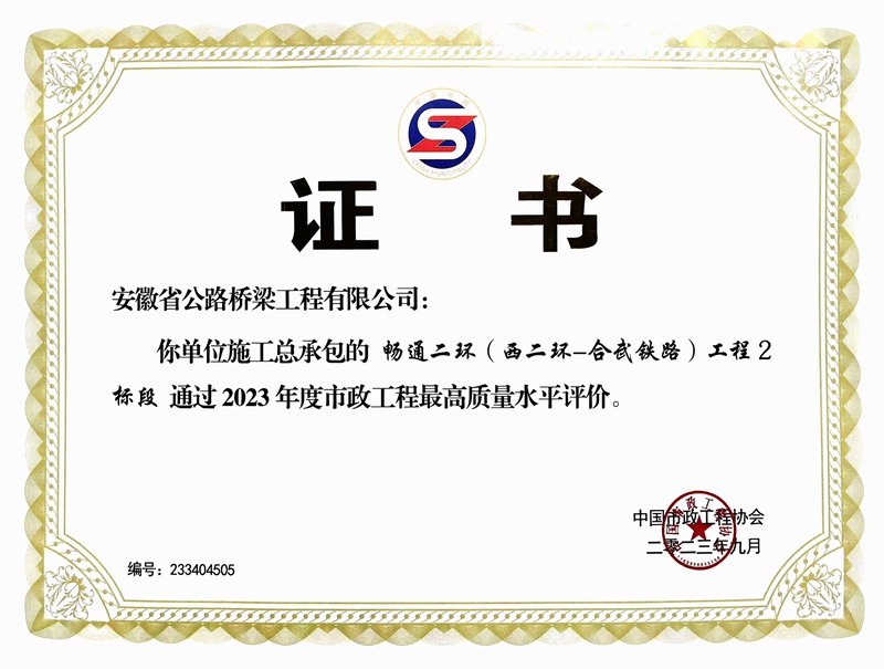 暢通二環(huán)(西二環(huán)-合武鐵路)工程2標(biāo)段榮獲市政最高質(zhì)量水平評價獎