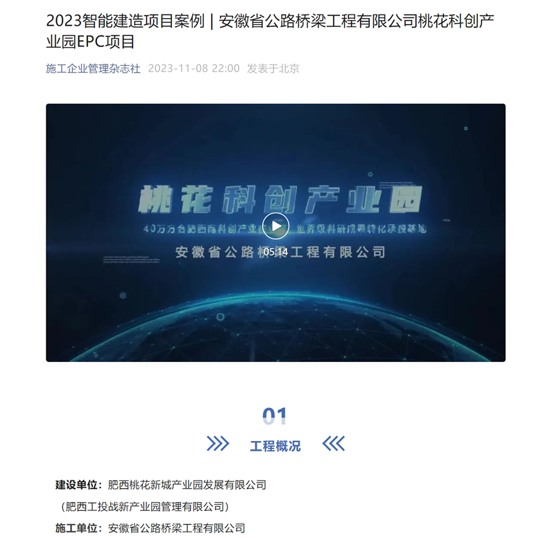 近日,從施工企業(yè)管理雜志社傳來喜訊,桃花科創(chuàng)產(chǎn)業(yè)園項目入選施工企業(yè)管理雜志社2023智能建造項目案例,同步對案例進行了專題介紹。