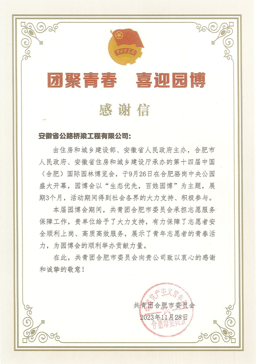 2023年5月至9月,公司集聚優(yōu)勢資源,承建園博園機(jī)場跑道修復(fù)及相關(guān)配套項目,高效完成各項施工任務(wù),為老機(jī)場跑道換上“新衣”,助力園博盛會精彩開幕。同時,在園博會期間,積極響應(yīng)合肥團(tuán)市委號召,組織招募青年志愿者,為園博會期間的各項活動做好服務(wù)保障工作,展現(xiàn)了新時期安徽路橋青年志愿者的風(fēng)采。