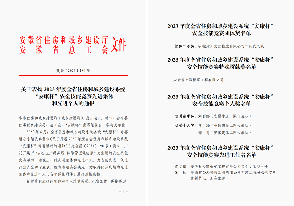 近日,安徽省總工會(huì)、住房城鄉(xiāng)建設(shè)廳聯(lián)合發(fā)布《關(guān)于表揚(yáng)2023年度全省住房和城鄉(xiāng)建設(shè)系統(tǒng)“安康杯”安全技能競賽先進(jìn)集體和先進(jìn)個(gè)人的通報(bào)》,公司榮獲競賽特殊貢獻(xiàn)獎(jiǎng),以公司選手為主力的安徽建工二隊(duì)獲得競賽團(tuán)體二等獎(jiǎng)。公司職工宋楨、李艾梅獲競賽“先進(jìn)工作者”,公司選手劉麗娜、邵博分獲競賽“優(yōu)秀選手獎(jiǎng)”“優(yōu)秀個(gè)人獎(jiǎng)”。