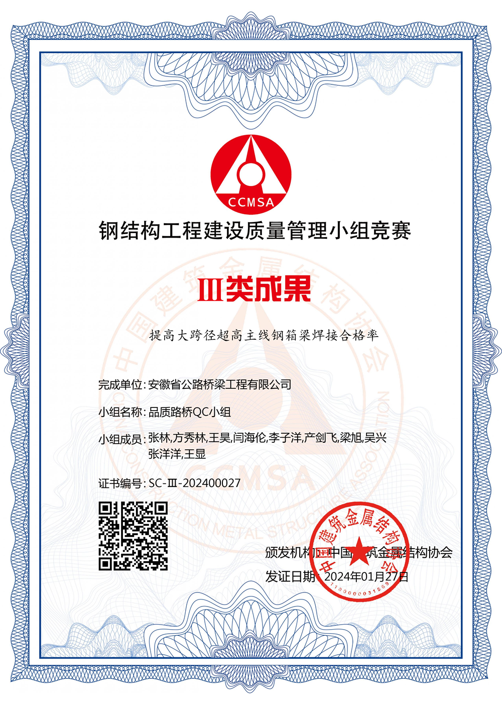 1月25日至27日,中國(guó)建筑金屬結(jié)構(gòu)協(xié)會(huì)在北京召開(kāi)“2023年鋼結(jié)構(gòu)工程建設(shè)質(zhì)量管理小組競(jìng)賽活動(dòng)”,公司獲得I類(lèi)成果2項(xiàng),III類(lèi)成果1項(xiàng)。