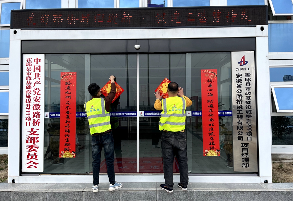 春節(jié)期間,霍邱縣市政基礎設施提升PPP項目值守人員與工友為項目門窗貼上春聯(lián)、福字,大家一起準備了年夜飯,共度佳節(jié),感受別樣的家的溫暖。
