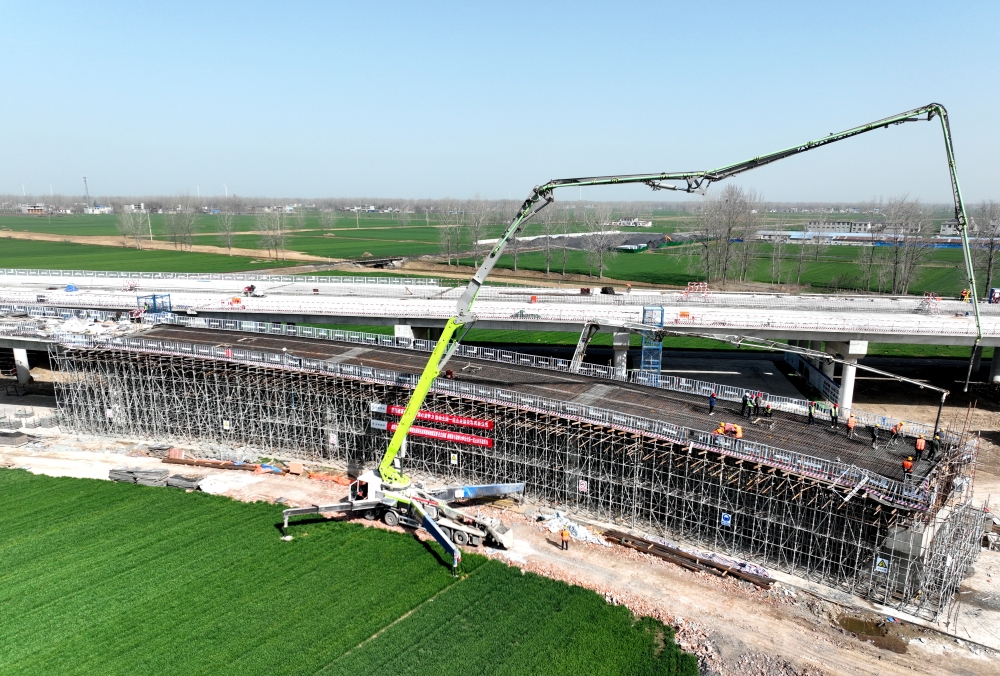 項目部提前謀劃部署,搶抓施工黃金時段,迅速組織路基工作面?zhèn)渫?,加?qiáng)勞務(wù)隊伍、機(jī)械設(shè)備和物資材料保障,在保證安全質(zhì)量的前提下,迅速投入到緊張的施工生產(chǎn)中。3月19日,順利完成渦陽互通DK0+233.949匝道橋第二聯(lián)現(xiàn)澆箱梁頂板澆筑,至此,標(biāo)段內(nèi)現(xiàn)澆箱梁全部完成澆筑。