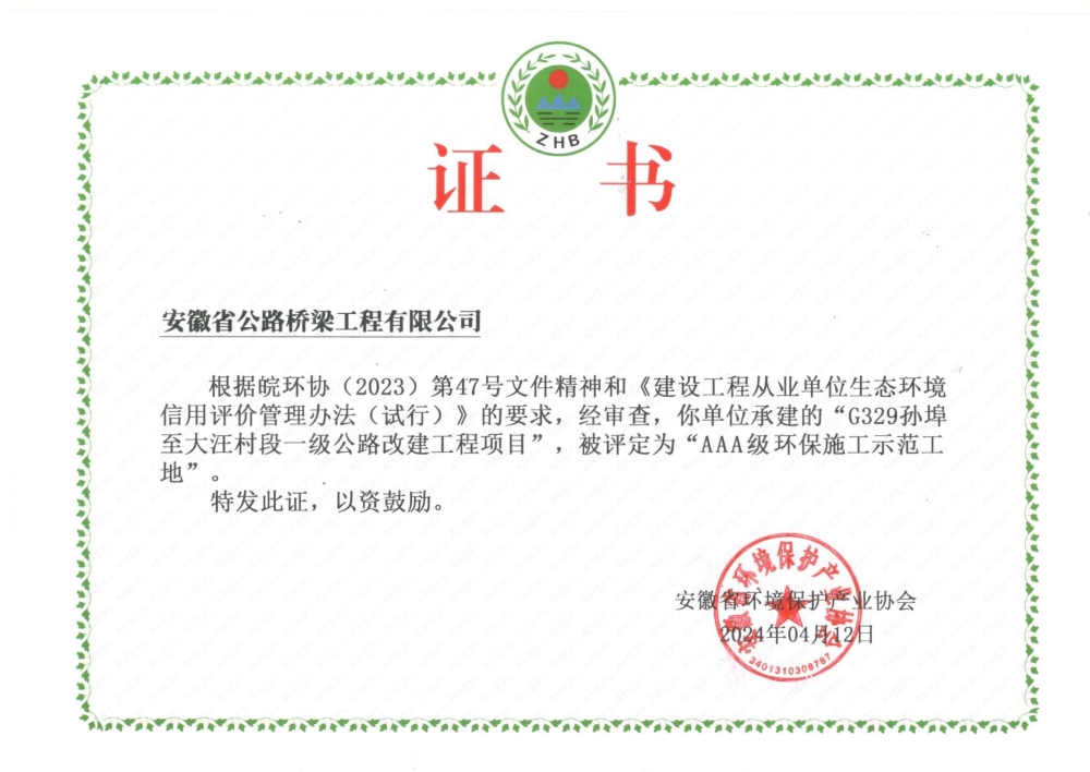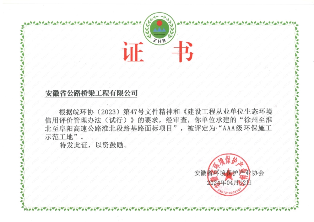 近日,安徽省環(huán)境保護(hù)產(chǎn)業(yè)協(xié)會(huì)公布了“2024年第2批建設(shè)工程從業(yè)單位生態(tài)環(huán)境信用評(píng)價(jià)結(jié)果”,由公司承建的徐州至淮北至阜陽高速公路淮北段路基路面標(biāo)、G329孫埠至大汪村段一級(jí)公路改建工程和合肥新橋國際機(jī)場(chǎng)綜合交通中心(含軌道引入)及配套工程施工總承包項(xiàng)目獲評(píng)安徽省“AAA級(jí)環(huán)保施工示范工地”稱號(hào)。