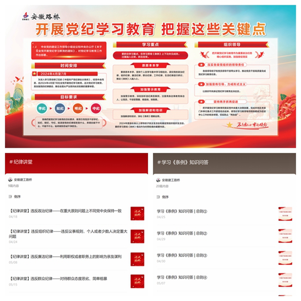 黨紀學習教育開展以來,公司黨委高度重視宣傳引導、氛圍提升。為擴大宣傳引導的接觸面,公司黨委統(tǒng)籌制定發(fā)布了黨紀學習教育展板。同時,立足“清風路橋”建設,加大宣傳力度,綜合運用官網(wǎng)、官微,設立“紀律講堂”“學習《條例》知識問答”等專欄,累計推出黨紀學習教育相關(guān)報道和學習材料80余篇次,做到“每日推送”。組織全體黨員職工參加公司內(nèi)網(wǎng)《條例》線上知識測試,以考助學、以訓促學,鞏固學習成果,檢驗學習成效,在全公司營造學紀、知紀、明紀、守紀的良好氛圍。各級黨組織通過“三會一課”等方式開展專題學習230余次,受教育黨員、職工累計超2500人次。