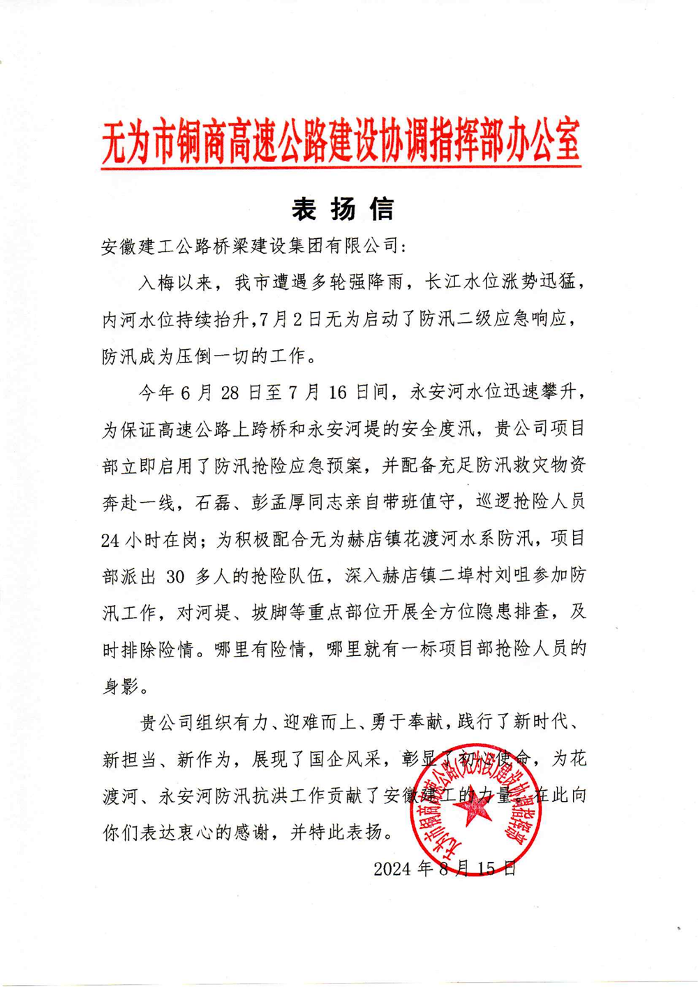 無為市銅商高速公路(無為段)建設(shè)協(xié)調(diào)指揮部對公司承建的銅商高速主體1標(biāo)項(xiàng)目部進(jìn)行表揚(yáng)。來信指出,汛期期間,項(xiàng)目部及時(shí)啟動防汛搶險(xiǎn)應(yīng)急預(yù)案,配足物資奔赴一線,迎難而上,安排人員24小時(shí)巡邏,開展全方位隱患排查,為防汛抗洪工作作出了突出貢獻(xiàn),展現(xiàn)了國企擔(dān)當(dāng)。