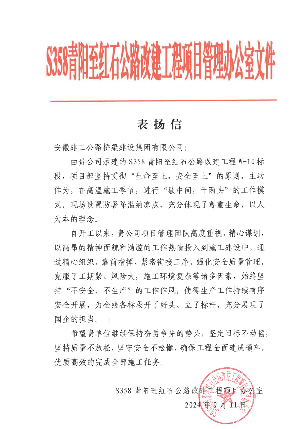 S358青陽至紅石公路改建工程項(xiàng)目辦公室來信指出,公司承建的W10標(biāo)在高溫施工季節(jié),堅(jiān)持貫徹“生命至上,安全至上”的原則、“不安全,不生產(chǎn)”的工作作風(fēng),落實(shí)防暑降溫措施和安全生產(chǎn)各項(xiàng)要求,體現(xiàn)了“以人為本”的理念。