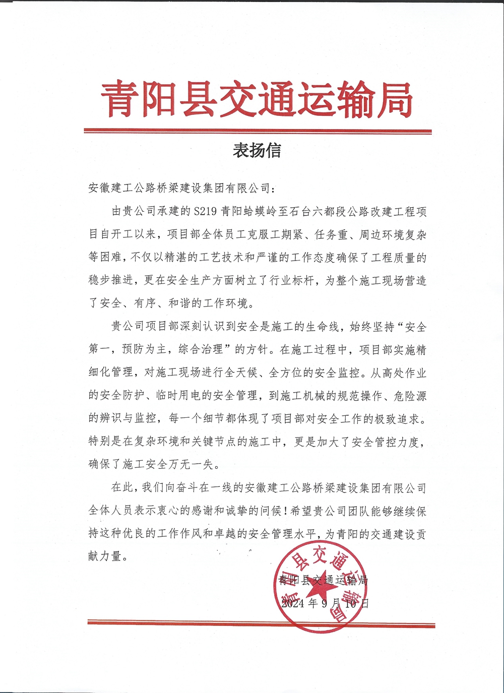 青陽縣交通運(yùn)輸局來信表示,青陽S219改建項(xiàng)目自開工以來,不斷克服工期緊、任務(wù)重、周邊環(huán)境復(fù)雜等困難,始終堅(jiān)持“安全第一,預(yù)防為主,綜合治理”的方針,安全穩(wěn)步推動項(xiàng)目建設(shè),在安全生產(chǎn)方面樹立了標(biāo)桿。