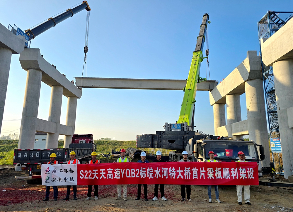 在S22天天高速YQB2標(biāo)關(guān)鍵控制性工程——皖水河特大橋施工現(xiàn)場(chǎng),項(xiàng)目部緊盯施工節(jié)點(diǎn),壓實(shí)責(zé)任抓落實(shí),順利完成首片預(yù)制箱梁架設(shè)。