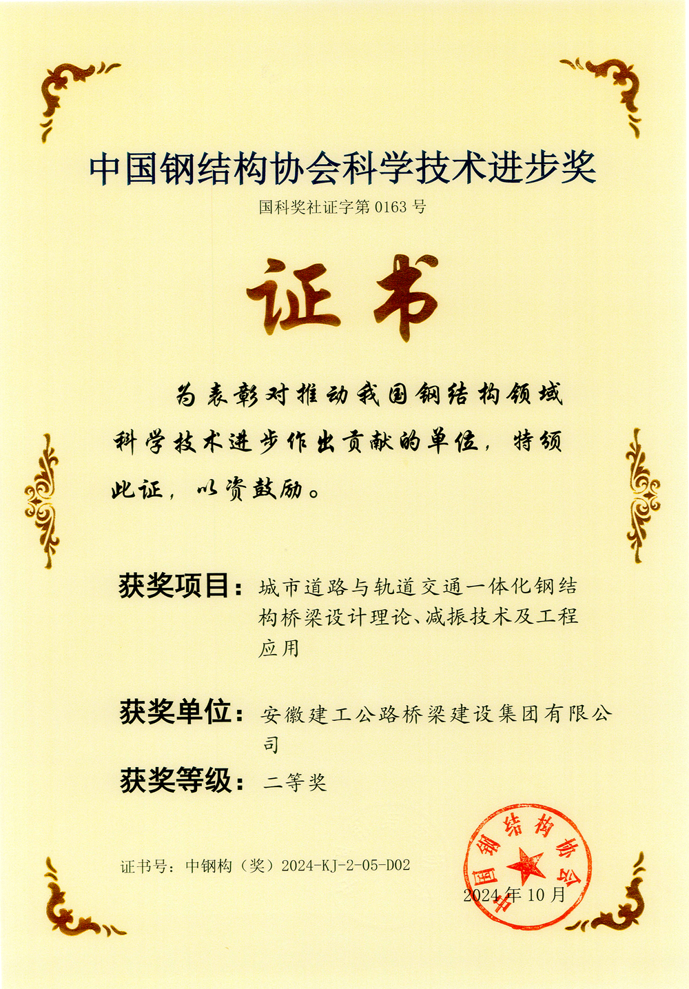 10月22日,“中國鋼結(jié)構(gòu)協(xié)會成立40周年紀念大會暨2024中國鋼結(jié)構(gòu)大會”在北京召開,會議對2024年度中國鋼結(jié)構(gòu)協(xié)會科學技術(shù)進步獎、技術(shù)創(chuàng)新獎進行了頒獎。公司參與的“城市道路與軌道交通一體化鋼結(jié)構(gòu)橋梁設(shè)計理論、減振技術(shù)及工程應(yīng)用”項目榮獲科學技術(shù)進步獎二等獎。