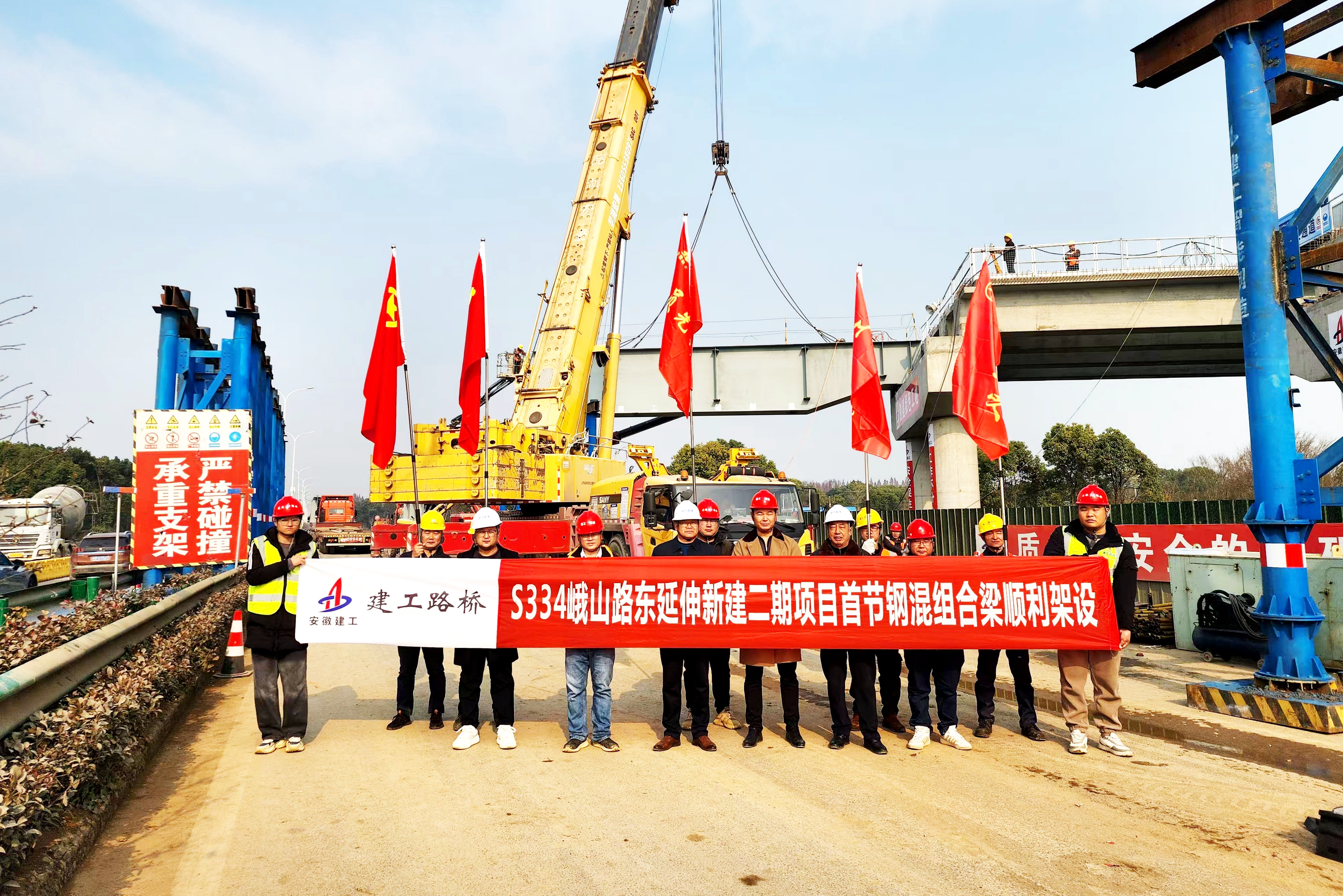 12月18日,S334峨山路東延伸新建二期工程項(xiàng)目首件鋼混組合梁順利架設(shè)。