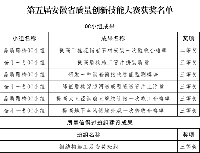 近日,第五屆安徽省質(zhì)量創(chuàng)新技能大賽獲獎(jiǎng)名單公布,公司申報(bào)的QC小組成果獲得二等獎(jiǎng)1項(xiàng),三等獎(jiǎng)5項(xiàng),申報(bào)的質(zhì)量信得過(guò)班組建設(shè)成果獲得三等獎(jiǎng)1項(xiàng)。