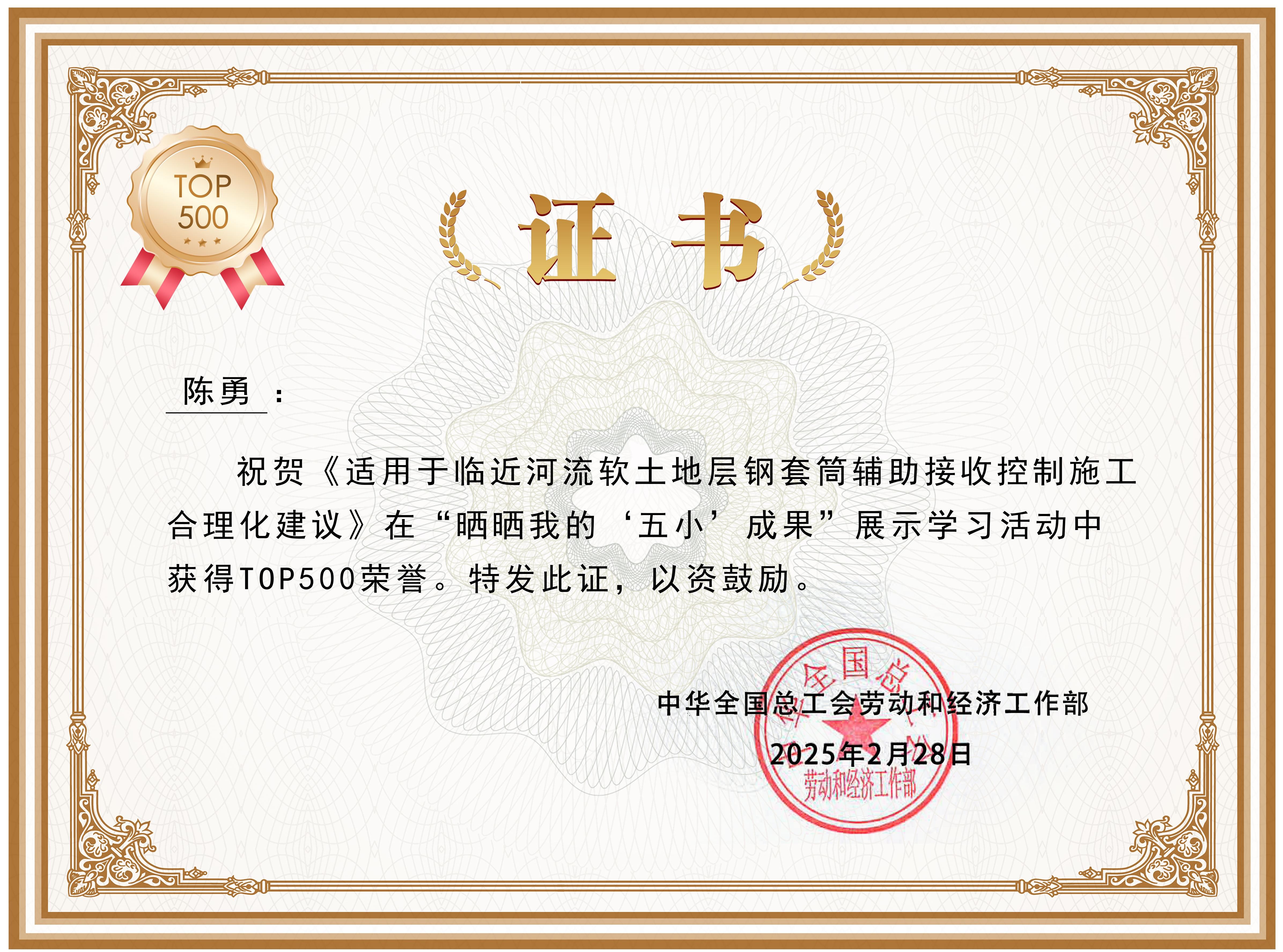 近日,中華全國總工會“曬曬我的‘五小’成果”展示學習活動結(jié)果揭曉,公司選送的《大跨度雙橢圓疊合結(jié)構(gòu)支點法施工技術(shù)》《適用于臨近河流軟土地層鋼套筒輔助接收控制施工合理化建議》經(jīng)過多輪投票,在5000個參選成果中脫穎而出,獲得TOP500殊榮,分別位列80名和147名。
