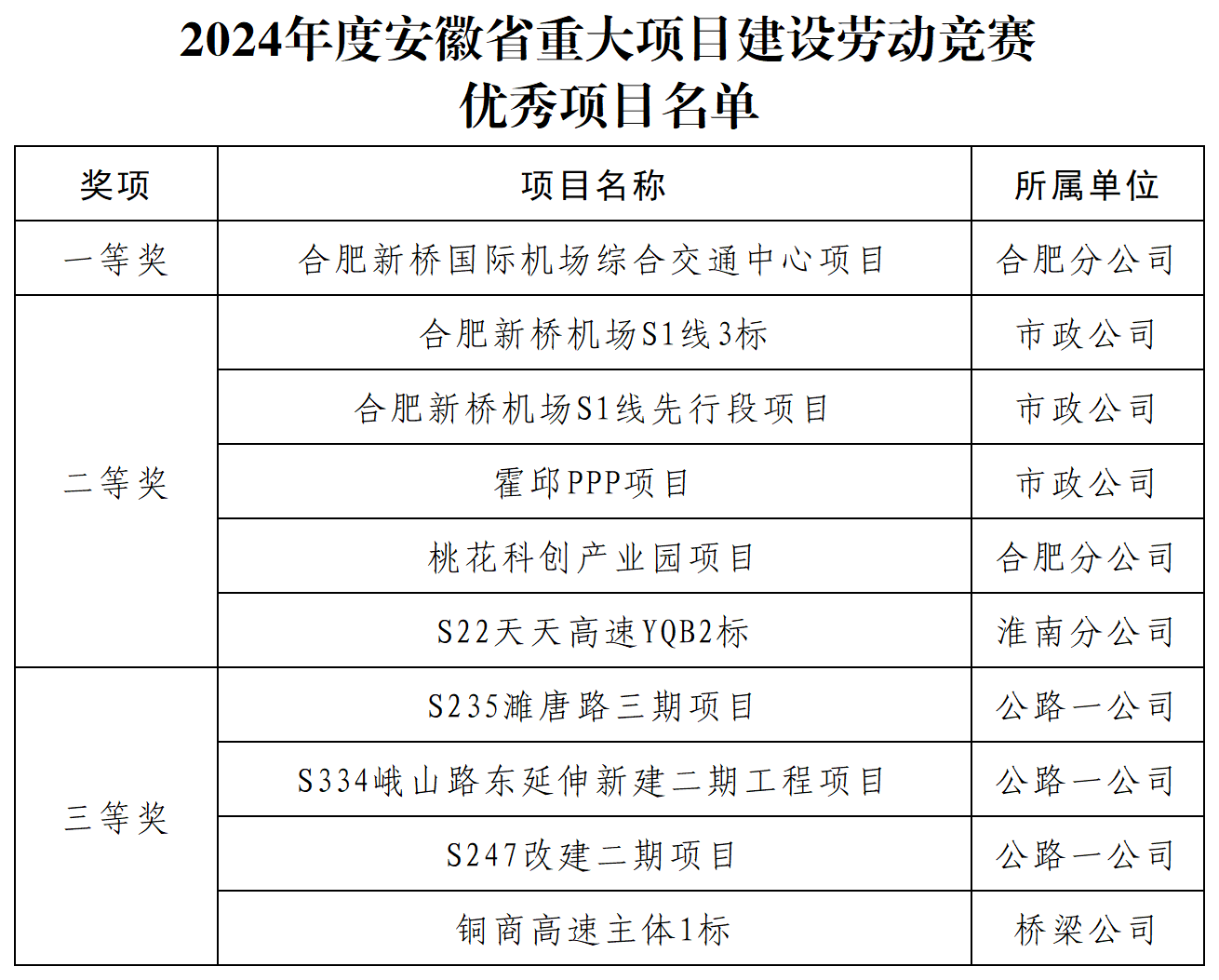 近日,安徽省住建廳與省總工會對2024年度重大項目建設(shè)勞動競賽參賽項目進行了通報表揚,公司承建的合肥新橋國際機場綜合交通中心項目、S1線3標等10個項目榮獲優(yōu)秀項目稱號。