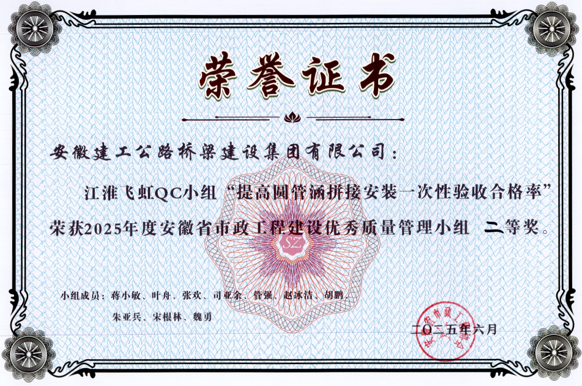 針對圓管涵等小結(jié)構(gòu)物外觀質(zhì)量通病,項(xiàng)目部成立“江淮飛虹”QC小組,聚焦混凝土質(zhì)量、模板工藝、振搗操作及養(yǎng)護(hù)管理等環(huán)節(jié)展開技術(shù)攻關(guān)。其課題《提高圓管涵拼接安裝一次性驗(yàn)收合格率》顯著提升了施工進(jìn)度與實(shí)體質(zhì)量,一次性驗(yàn)收通過省去了整改、復(fù)檢時(shí)間,確保圓管涵施工按計(jì)劃銜接后續(xù)工序,助力項(xiàng)目率先完成全線40道圓管涵施工;合格的拼接安裝減少了后期漏水、沉降、結(jié)構(gòu)開裂等隱患,提升了工程耐久性和質(zhì)量穩(wěn)定性。該成果有效降低了成本損耗、保障了工期推進(jìn),榮獲2025年度安徽省工程建設(shè)質(zhì)量與安全協(xié)會QC活動一等獎(jiǎng)及安徽省市政工程建設(shè)優(yōu)秀質(zhì)量管理小組二等獎(jiǎng)。