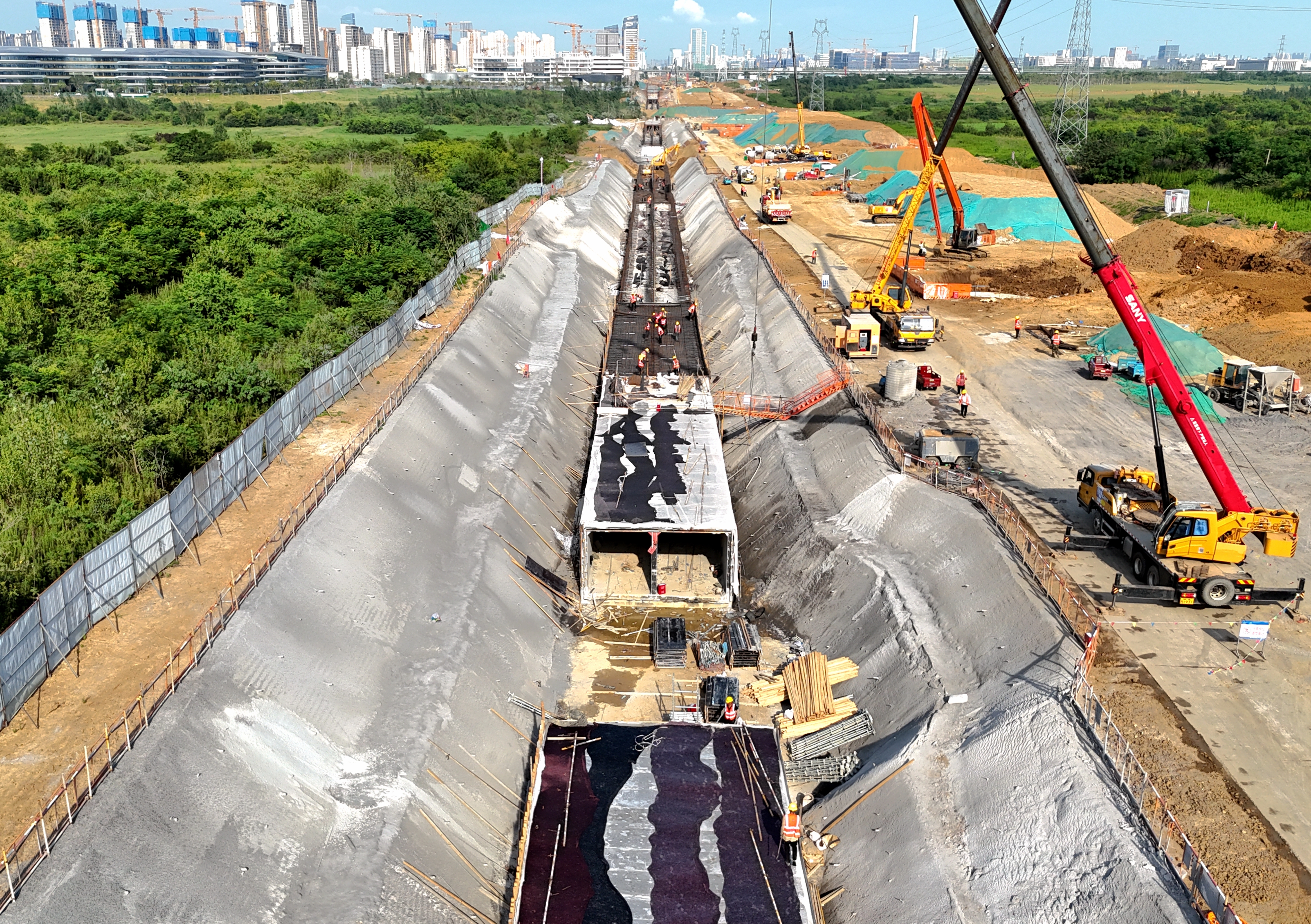 自項目開工建設以來,全體參建人員凝心聚力、攻堅克難,工程推進成效顯著。截至目前,項目各分項工程均按計劃穩(wěn)步推進,路基工程采用分段平行施工模式高效完成清表3170米、清淤6000方;橋梁工程樁基全線完工,橋梁下部結構施工按序推進,預制梁板同步進入標準化生產(chǎn)階段。管廊工程作為項目建設的“重頭戲”,已完成全線3170米基坑開挖,同步推進底板、頂板結構施工,其中底板結構澆筑完成1200米,頂板結構完成440米。