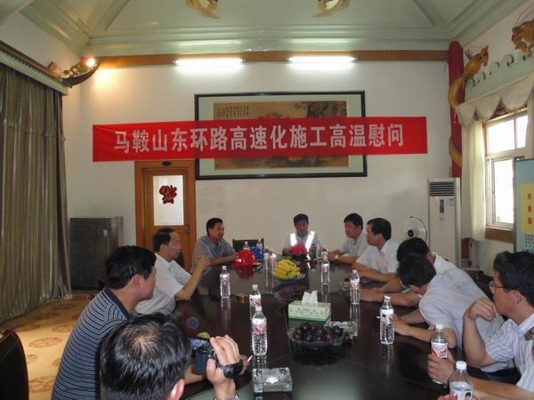 在我項(xiàng)目部大廳,王書記首先發(fā)表了熱情洋溢的講話,高度贊揚(yáng)了我項(xiàng)目勇戰(zhàn)高溫、搶抓工期、誓保質(zhì)量的大無畏施工精神。隨后,王書記又送上了慰問信,并與員工代表們一一握手,發(fā)放慰問金、慰問品。最后,在項(xiàng)目部會(huì)議室,王書記一行與蘇指揮長(zhǎng),蔡主任、江主任,總監(jiān)代表郭亮以及我部項(xiàng)目經(jīng)理冷峰等進(jìn)行座談,詳細(xì)了解了我南環(huán)02標(biāo)項(xiàng)目的整體情況以及近期施工的進(jìn)展情況,希望我部繼續(xù)發(fā)揚(yáng)安徽省路橋公司攻堅(jiān)克難的優(yōu)良傳統(tǒng),保質(zhì)保量的如期完成東環(huán)02標(biāo)項(xiàng)目建設(shè)任務(wù)。