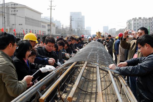 項目辦負責人向?qū)W員們簡單介紹了工程概況。學員們在工人師傅的指導下,紛紛戴上手套、拿起工具,給已成型的樁基鋼筋籠綁扎鋼絲,親身體驗了建設(shè)者的辛勞。學員們虛心向工人師傅學習,緊圍著鋼筋籠,一邊認真扎絲,一邊相互交流,探討綁扎技巧。在學員們的巧手下,兩個鋼筋籠很快完成綁扎,將用于晚間施工。