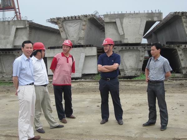 在泗泗01標,戴總一行首先在項目部會議室聽取了由項目經理江仲明所做的關于泗泗01標工程建設、施工進度、安全文明建設、規(guī)范化管理等方面的詳細匯報。在聽取匯報過程中,戴總等領導就安全管理、文明施工、標準化工地建設方面與項目經理及總工進行了深入的交流,并給予了切實可行的指導意見。會后,戴總一行來到該標的預制梁場進行了實地檢查,主要對施工現場的蓋梁骨架、箱梁澆筑與養(yǎng)生、施工用電、施工機具、安全生產宣傳以及文明施工情況進行了詳細的檢查。并就該標箱梁預制所采用的后張拉技術與項目總工石懷遠進行了深層次的交流。在檢查結束后,集團領導對此次的檢查結果作了總結。戴總對該標開工以來所取得的成績,以及在質量、安全文明施工與項目管理方面所做的工作給予了充分肯定,同時他強調:安全是生產的保障,文明是素質的體現,質量是建設的關鍵,必須以“深入貫徹安全文明生產”為核心,要以強化安全意識、提高安全文明素質為著力點,切實加強安全文明示范工地建設,建設優(yōu)質工程。