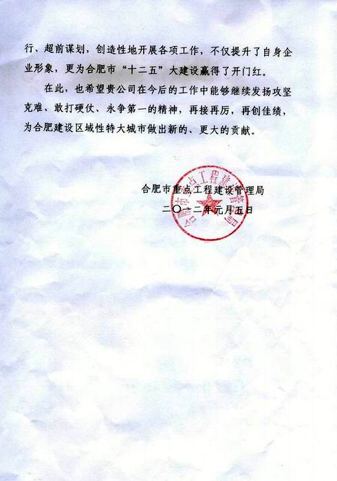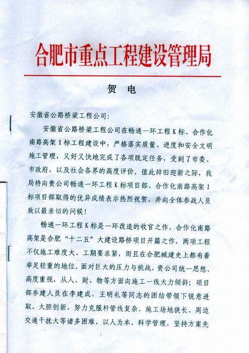 合肥市重點(diǎn)局發(fā)賀電對(duì)公司在市政建設(shè)中的優(yōu)異成績(jī)表示祝賀