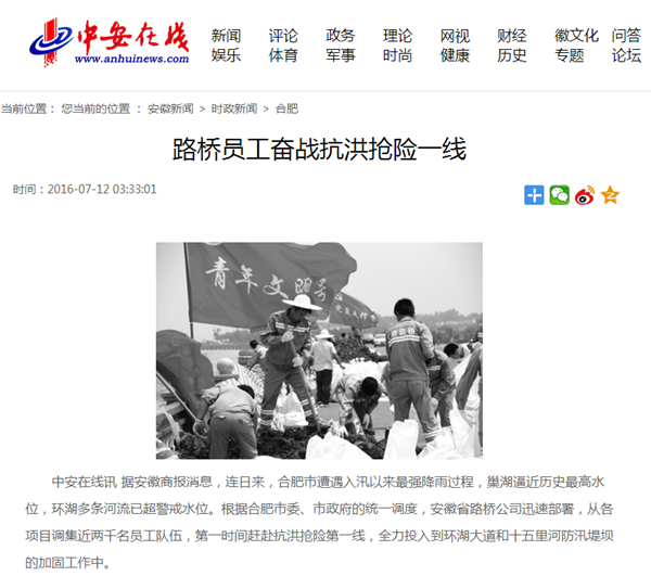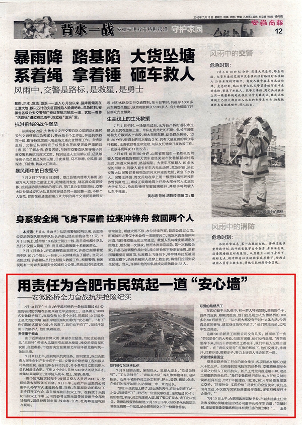 近日,公司積極響應(yīng)合肥市委、市政府號召,全力參與環(huán)湖大道和十五里河抗洪搶險的事跡得到社會的高度關(guān)注。7月12日、13日,中安在線、《安徽商報》等多家省級媒體對公司抗洪搶險事跡進行了連續(xù)報道。