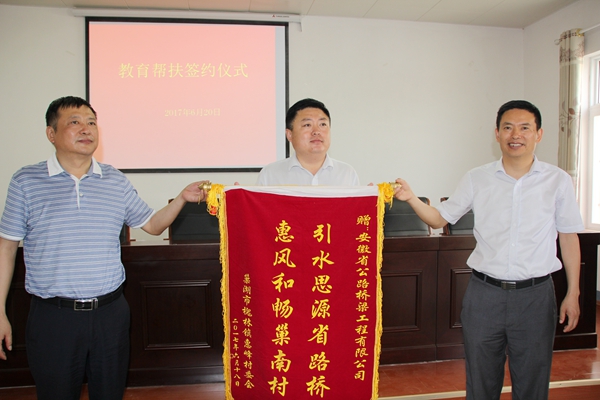 6月20日下午,在巢湖市槐林鎮(zhèn)惠峰村活動中心,槐林鎮(zhèn)黨委主要負(fù)責(zé)人將一面錦旗贈予安徽省公路橋梁工程有限公司,以感謝公司為當(dāng)?shù)胤鲐毠ぷ髯鞒龅呐拓暙I(xiàn)。公司黨委委員、副總經(jīng)理任杰代表公司接受了錦旗。