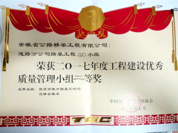近日,在中國施工企業(yè)協(xié)會2017年度全國工程建設(shè)質(zhì)量QC小組成果發(fā)布暨評審會上,由道路分公司QC小組選送的《提高高填方路基不均勻沉降合格率》成果,從全國千余個QC成果中脫穎而出,以優(yōu)異的成績榮獲2017年度工程建設(shè)優(yōu)秀質(zhì)量管理小組成果二等獎,為公司贏得了榮譽。