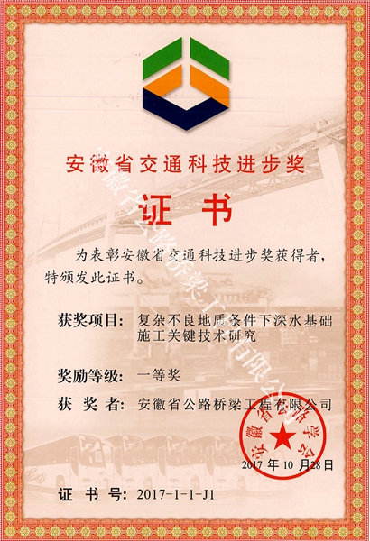 《復(fù)雜不良地質(zhì)條件下深水基礎(chǔ)施工關(guān)鍵技術(shù)研究》是以濟(jì)祁淮河特大橋基礎(chǔ)施工為背景,深入研究了樁基施工到圍堰施工一體系成套基礎(chǔ)施工關(guān)鍵技術(shù),創(chuàng)新式的改進(jìn)結(jié)構(gòu)及施工工藝使得體系結(jié)構(gòu)受力合理。該施工技術(shù)及理論從實(shí)踐中總結(jié)得出,并在項(xiàng)目施工中成功驗(yàn)證。2017年7月,經(jīng)中國(guó)公路建設(shè)行業(yè)協(xié)會(huì)組織的專(zhuān)家鑒定,該技術(shù)成果達(dá)到國(guó)際先進(jìn)水平?!洞笄输摌蛎驿佈b雙層高粘SMA瀝青瑪蹄脂碎石施工技術(shù)》重點(diǎn)對(duì)大曲率鋼橋的安裝施工方法進(jìn)行了描述,同時(shí)橋面鋪裝施工首次采用基質(zhì)瀝青添加直投式RST高粘瀝青改性劑,采用特殊的礦料級(jí)配,結(jié)合靜態(tài)碾壓工藝,成功解決了鋼橋面變形性能導(dǎo)致的壓實(shí)度不易控制的難題,有效提高了施工質(zhì)量。2017年7月,經(jīng)專(zhuān)家鑒定,該技術(shù)成果達(dá)到國(guó)內(nèi)先進(jìn)水平。