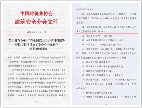近日,從中國建筑業(yè)協(xié)會(huì)建筑安全分會(huì)傳來喜訊,公司承建的阜陽北路高架01標(biāo)和合寧高速改擴(kuò)建路基路面工程05標(biāo)兩項(xiàng)工程榮獲“2018年全國建設(shè)工程項(xiàng)目施工安全生產(chǎn)標(biāo)準(zhǔn)化工地”榮譽(yù)稱號。