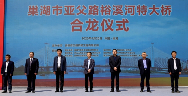4月26日,由公司承建的皖中新地標(biāo)巢湖亞父路裕溪河特大橋經(jīng)過(guò)2年多的建設(shè)順利合龍。巢湖市副市長(zhǎng)張明權(quán)參加合龍儀式并宣布大橋正式合龍,股份公司黨委副書(shū)記、副總經(jīng)理孫學(xué)軍,巢湖市重點(diǎn)工程建設(shè)管理中心主任曾瑾、居巢經(jīng)濟(jì)開(kāi)發(fā)區(qū)管委會(huì)主任王慶林、巢湖市地方海事處處長(zhǎng) 沐小平、合肥市規(guī)劃設(shè)計(jì)研究院院長(zhǎng)黃從俊,公司領(lǐng)導(dǎo)錢(qián)申春、任杰、杜海峰出席合龍儀式。