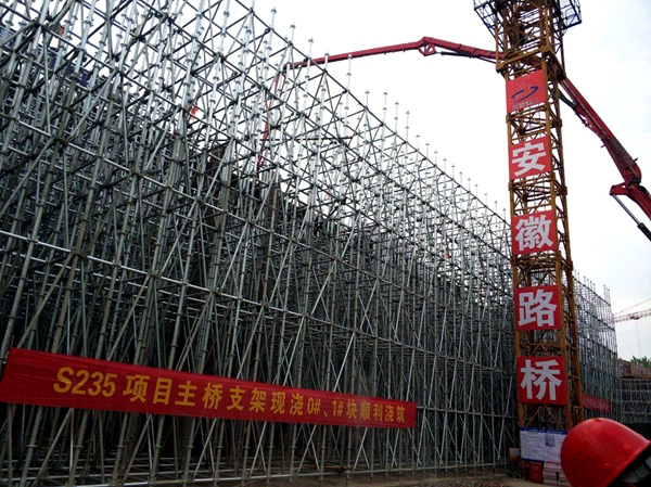 為突破原有施工方案對工程進(jìn)度的瓶頸制約,項(xiàng)目部多方聯(lián)系,充分論證優(yōu)化方案,一方面,將主橋原定的碗扣支架改為盤扣支架施工,大大加快了搭拆速度,提高了質(zhì)量與安全,有效節(jié)約了成本。另一方面,將原先的半幅現(xiàn)澆調(diào)整為全幅現(xiàn)澆方案,有效縮短了工期。