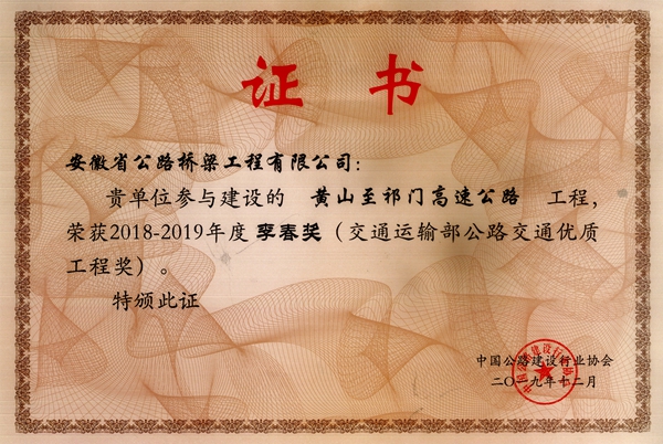 近期,由中國(guó)公路建設(shè)行業(yè)協(xié)會(huì)組織的“全國(guó)公路高質(zhì)量發(fā)展云端論壇”正式落幕。期間,以網(wǎng)絡(luò)形式頒發(fā)了2018-2019年度李春獎(jiǎng)。公司參與建設(shè)的“黃山至祁門(mén)高速公路”工程榮獲李春獎(jiǎng)。