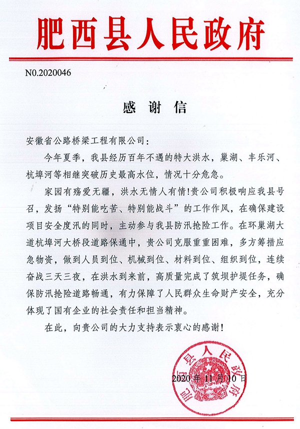 11月10日,肥西縣人民政府給公司送來一封感謝信,高度贊揚公司在防汛搶險工作中的突出貢獻(xiàn)和國企擔(dān)當(dāng)精神,并向公司致以衷心感謝。