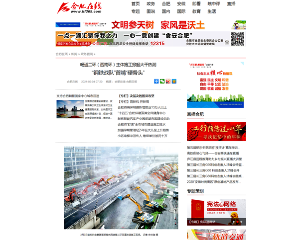 人民網(wǎng)【新春走基層】專欄報(bào)道了該項(xiàng)目大年三十工地不打烊,參建人員持續(xù)奮戰(zhàn)在施工一線。中國(guó)日?qǐng)?bào)海外版《End of the road》、合肥日?qǐng)?bào)《“鋼鐵戰(zhàn)隊(duì)”首啃“硬骨頭”》報(bào)道了公司第二次對(duì)老舊匝道橋拆除工作的場(chǎng)景。安徽衛(wèi)視超級(jí)新聞場(chǎng)等媒體以《“鋼鐵戰(zhàn)士”組隊(duì) 南二環(huán)改造工程第二階段施工啟動(dòng)》報(bào)道了南二環(huán)改造工程順利進(jìn)入第二階段施工節(jié)點(diǎn)的訊息。學(xué)習(xí)強(qiáng)國(guó)合肥學(xué)習(xí)平臺(tái)、澎湃新聞以《合肥:暢通南二環(huán) 鉚足干勁 大干正酣》為題,合肥新聞聯(lián)播以《“步履不停”保暢通 建設(shè)按下“快進(jìn)鍵”》《過(guò)年堅(jiān)守南二環(huán) 來(lái)年道路早暢通》為題,報(bào)道了春節(jié)期間該項(xiàng)目施工現(xiàn)場(chǎng)干出的“加速度”。抖音等自媒體平臺(tái)以短視頻形式展示了數(shù)十臺(tái)機(jī)械同時(shí)作業(yè)的震撼場(chǎng)面,關(guān)注熱度超過(guò)3百萬(wàn),安徽路橋速度得到合肥市民的再次點(diǎn)贊。