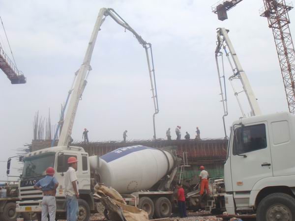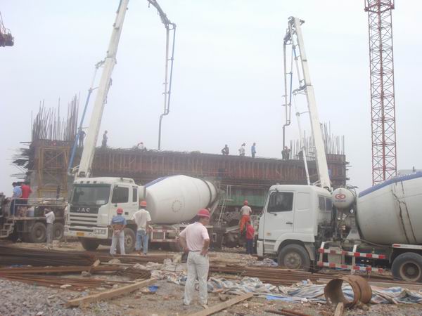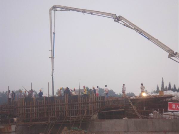 盛夏季節(jié),驕陽(yáng)似火。經(jīng)項(xiàng)目部科學(xué)組織、精心準(zhǔn)備、合理安排,2009年6月21日上午六安市淠望路大橋工地上人頭攢動(dòng)、機(jī)器轟鳴,兩臺(tái)混凝土泵車(chē)高高聳立在大橋主墩0#塊上面。九時(shí)許,經(jīng)現(xiàn)場(chǎng)監(jiān)理組和業(yè)主驗(yàn)收后,淠望路大橋主墩0#塊開(kāi)始澆注混凝土,現(xiàn)場(chǎng)施工人員克服高溫酷暑天氣,經(jīng)過(guò)個(gè)5個(gè)多小時(shí)的連續(xù)奮戰(zhàn),于當(dāng)天下午三點(diǎn)順利完成混凝土的澆筑工作。