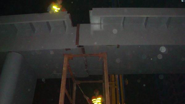 晚上21:30,運(yùn)梁車(chē)準(zhǔn)時(shí)將A梁運(yùn)達(dá)施工區(qū),隨即北一環(huán)南側(cè)在交警的協(xié)助下,按計(jì)劃全封閉。經(jīng)過(guò)近一個(gè)多小時(shí)的安裝,晚上23:00整,張洼路天橋施工區(qū)響起了一陣陣掌聲,禮炮隨后騰空燃起——A梁成功安裝了。B梁在隨后的3個(gè)小時(shí)內(nèi)也成功完成安裝。